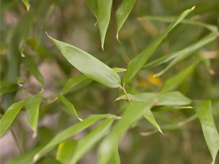 Die immergrünen Blätter des Schirmbambus sind dunkelgrün, lanzettlich.