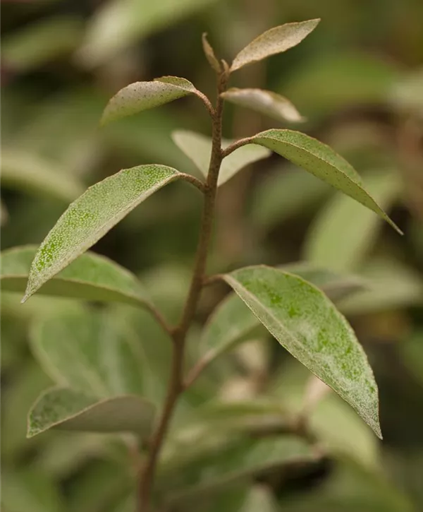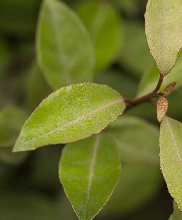 Hoher Blattschmuckwert. Die wintergrünen Blätter der Wintergrüne Ölweide sind dunkelgrün, lanzettlich, glänzend, ledrig, wechselständig. Diese sind etwa 6 - 10 cm groß.