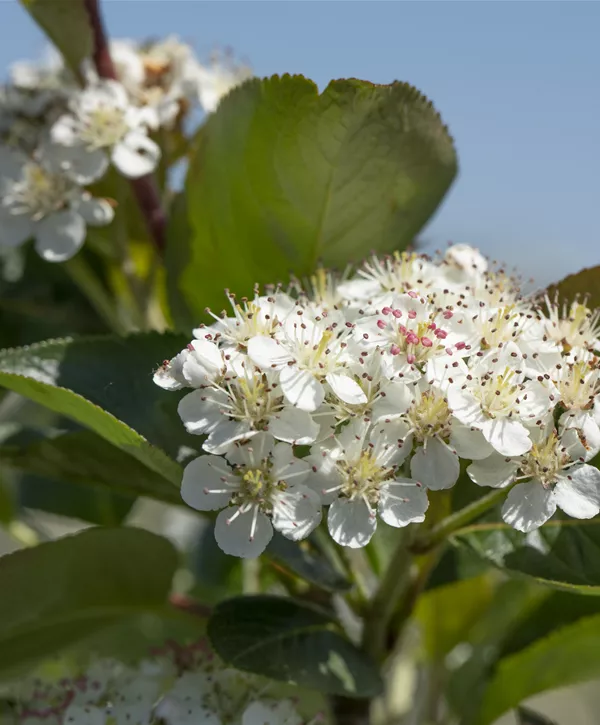 Aronia x prunifolia 'Viking' bildet in Rispen angeordnete, weiße Blüten ab Mai.