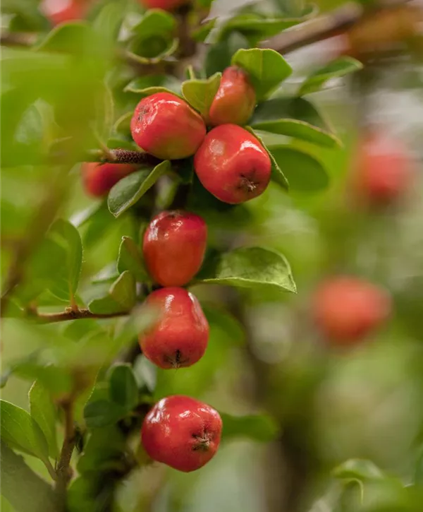 Besonders dekorativ sind die orange-roten, runden Beeren von Cotoneaster dammeri 'Coral Beauty'. Diese erscheinen ab August. Haften sehr lange.