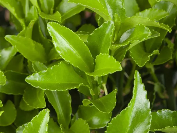 Hoher Blattschmuckwert. Die immergrünen Blätter der Kriechspindel 'Canadale Gold' sind grün und weisen einen weißen oder gelben Rand auf.