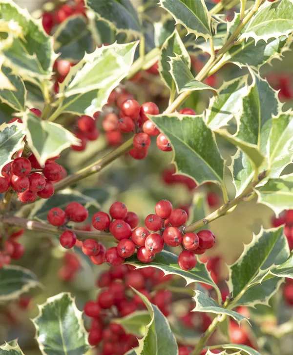 Besonders dekorativ sind die roten Steinfrüchte von Ilex aquifolium 'Argentea Marginata'. Diese erscheinen ab Oktober.Haften sehr lange.