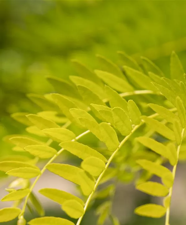 Die sommergrünen Blätter des Lederhülsenbaums 'Sunburst' sind hellgrün, gefiedert. Diese sind etwa 3 - 4 cm groß. Goldgelber Austrieb. Lederhülsenbaum 'Sunburst' zeigt sich leuchtend bernsteingelb im Herbst.