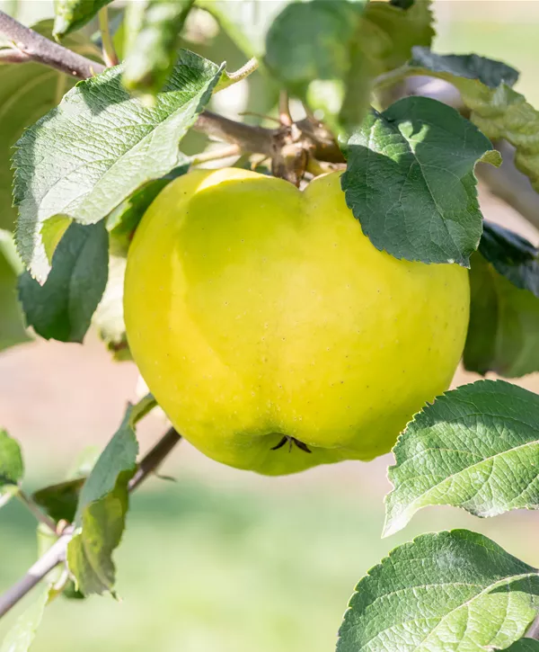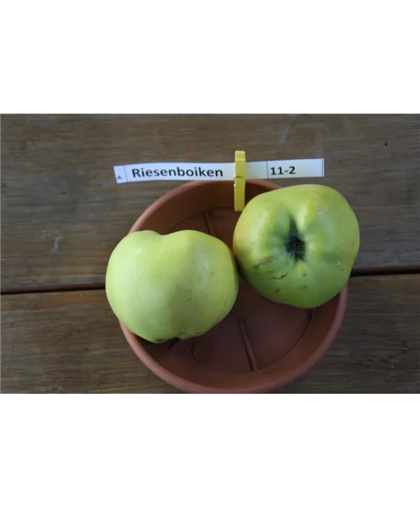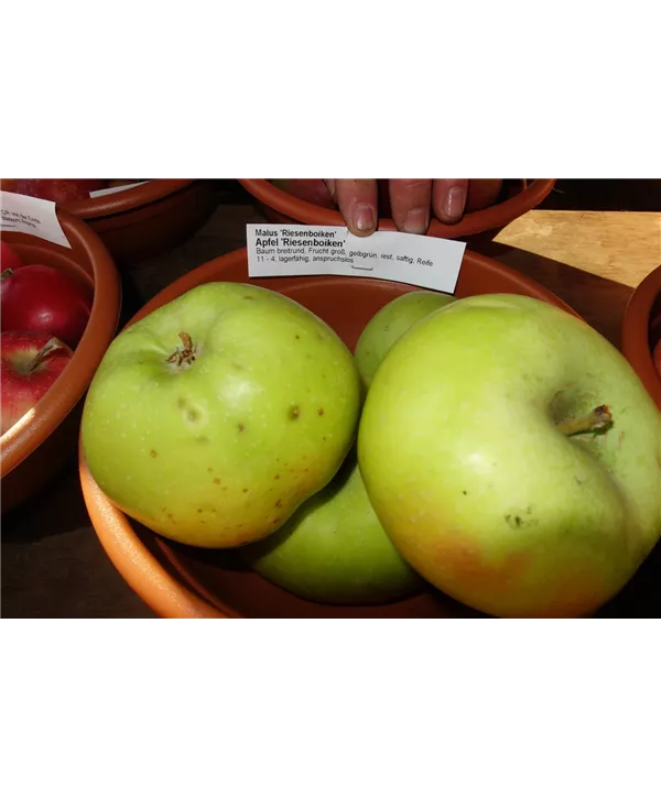 Der Apfel 'Riesenboiken' (Malus domestica) bildet grüngelbe, sehr große, saftige Früchte. Sie haben einen süß-säuerlichen Geschmack. Für eine ertragreiche Ernte ab Ende Oktober schaffen durchlässiger, nährstoffreicher Boden und ein sonniger bis halbschattiger Standort optimale Bedingungen. Seine hellrosafarbenen Blüten sind eine schöne Erscheinung. Der Apfel 'Riesenboiken' wird mit seinem aufrechten und breiten Wuchs etwa 4,5 m hoch und 3,5 m breit.