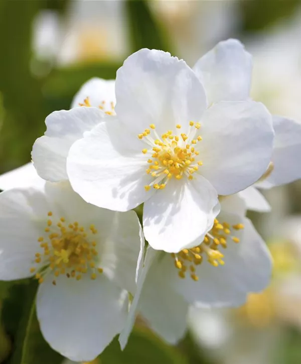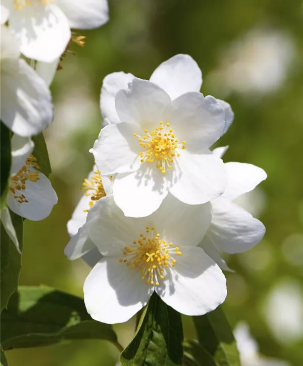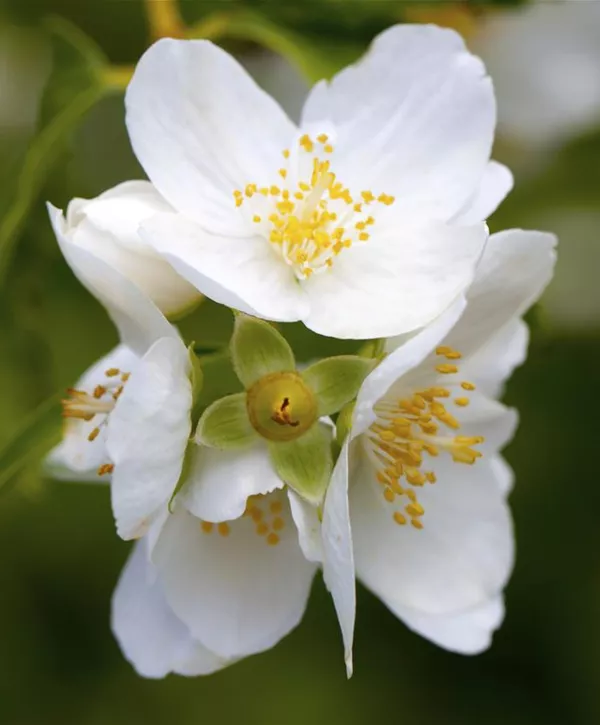 Die weißen, schalenförmigen Blüten des Duftender Bauernjasmin erscheinen in Trauben von Mai bis Juni. Diese sind stark duftend.