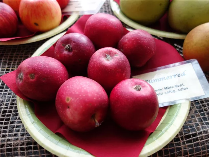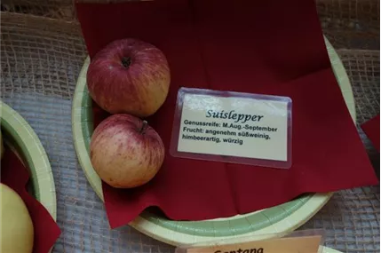 Der Apfel 'Roter Berlepsch' (Malus domestica) bildet rote, kleine, saftige Früchte. Sie haben einen säuerlichen, würzigen Geschmack. Für eine ertragreiche Ernte ab September schaffen durchlässiger, nährstoffreicher Boden und ein sonniger bis halbschattiger Standort optimale Bedingungen. Auch seine hellrosafarbenen Blüten sind eine schöne Erscheinung.