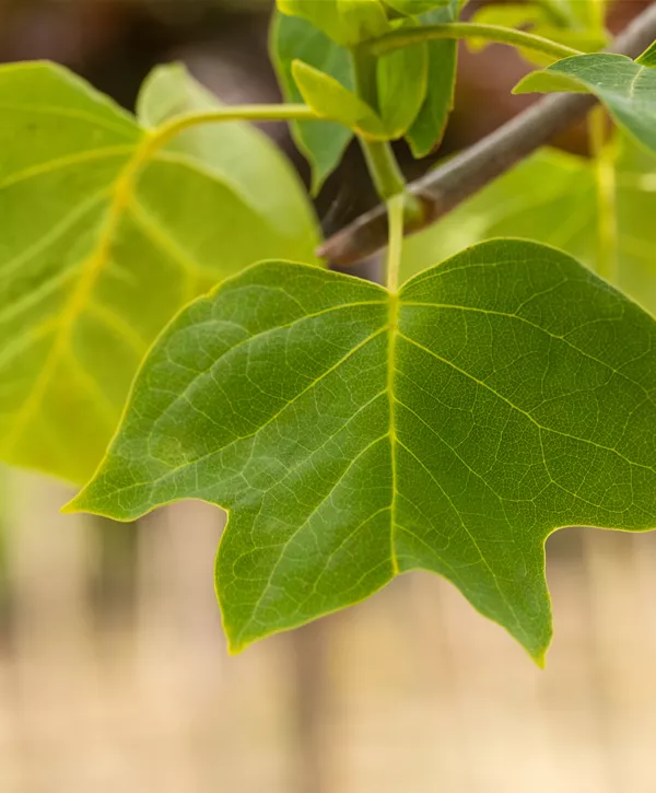 Die sommergrünen Blätter des Tulpenbaums 'Edward Gursztyn' sind mittelgrün, eiförmig, wechselständig, gelappt. Tulpenbaum 'Edward Gursztyn' zeigt sich leuchtend goldgelb im Herbst.