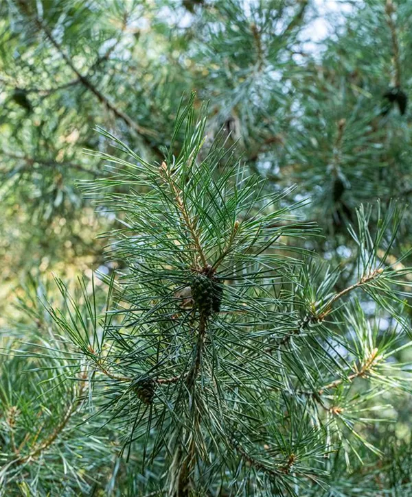 Zirbelkiefer ist ein pyramidal wachsender, malerischer Baum mit lockerer Krone. Ihre dunkelgrünen Blätter sind nadelförmig . An einem sonnigen Standort mit durchlässigem Boden erreicht sie gewöhnlich eine Höhe von ca. 25 m und wird ca. 8 m breit.
