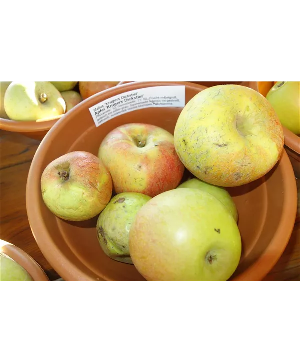 Der Apfel 'Krügers Dickstiel' (Malus domestica) bildet rot-gelbe, mittelfeste Früchte. Sie sind rund und haben einen süß-säuerlichen, erfrischenden Geschmack. Für eine ertragreiche Ernte ab Anfang Oktober schaffen durchlässiger, nährstoffreicher Boden und ein sonniger bis halbschattiger Standort optimale Bedingungen. Seine hellrosafarbenen Blüten sind eine schöne Erscheinung. Der Apfel 'Krügers Dickstiel' wird mit seinem aufrechten und breiten Wuchs etwa 4 m hoch und 3 m breit.