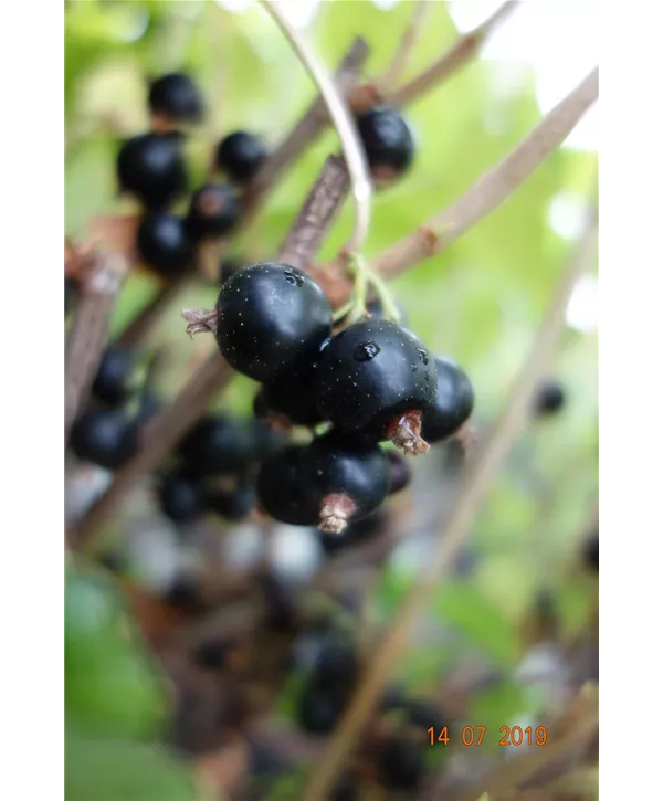 Die Johannisbeere 'Titania'(s) (Ribes nigrum) bildet schwarze, große Beeren. Diese sind süß-säuerlich im Geschmack. Für eine ertragreiche Ernte ab Juli schaffen durchlässiger, nährstoffreicher Boden und ein sonniger bis halbschattiger Standort optimale Bedingungen. Auch ihre grünen Blüten sind eine schöne Erscheinung.