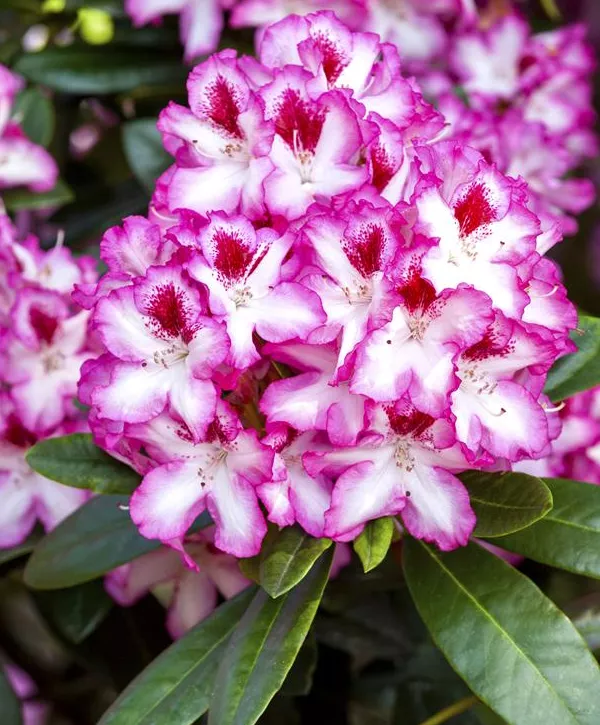 Rhododendron 'Hachmann´s Charmant'(s) bildet von Anfang Mai bis Mitte Juni zahlreiche trichterförmige, in Dolden angeordnete, zweifarbige Blüten.