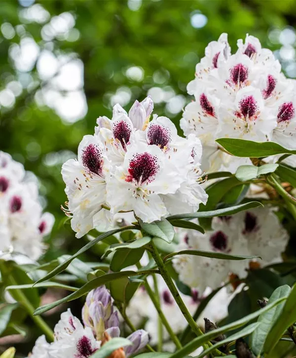 Rhododendron 'Maroon Sappho' bildet von Mai bis Juni zahlreiche trichterförmige, in Dolden angeordnete, zweifarbige Blüten.