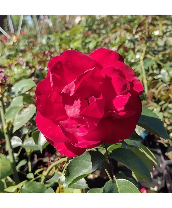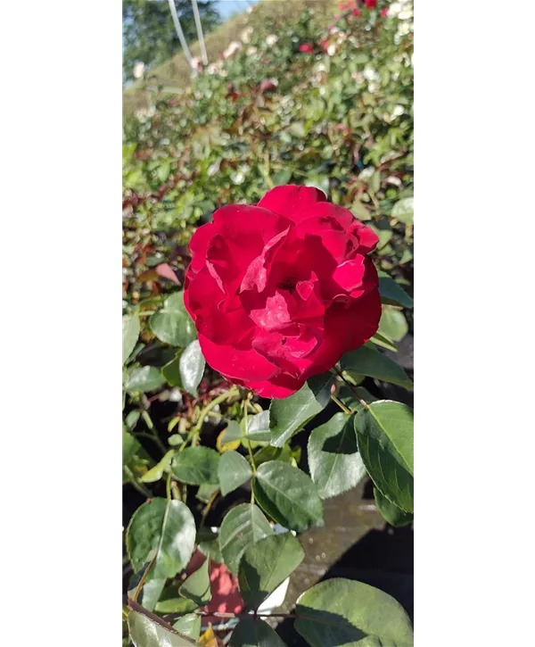 Die Strauchrose 'Grandhotel'® (Rosa) ist eine reichblühende Rose, die im Garten eine besondere Rolle spielt. Die gefüllten Blüten sind blutrot und erscheinen zahlreich von Juli bis September. Mit den richtigen Begleitern an ihrer Seite, kommt die Königin der Blumen besonders gut zur Geltung. Niedrige Stauden, Lavendel und Salbei eignen sich ganz gut für diese Zwecke.