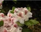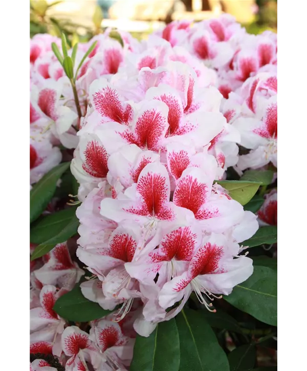 Rhododendron 'Belami'® bildet von Mitte Mai bis Anfang Juni zahlreiche trichterförmige, in Dolden angeordnete, rot-weiße Blüten.