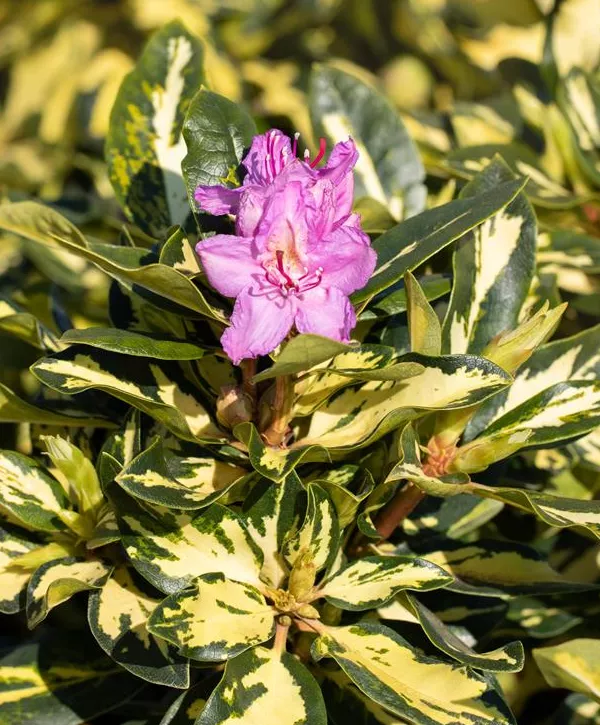 Der Rhododendron 'Blattgold' ist immergrün und trägt gelbbunte lanzettliche Blätter.