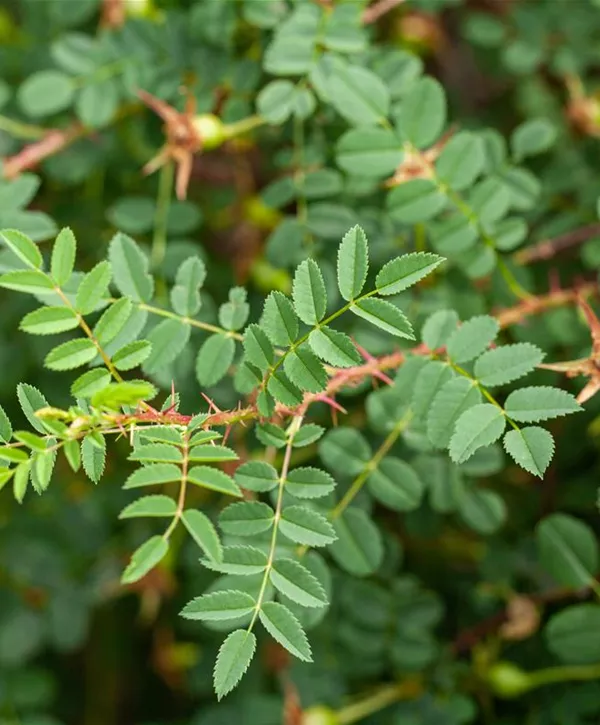Die Triebe von Rosa spinosissima sind bestachelt.