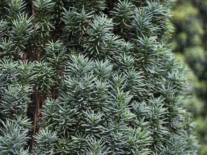Die Kegel-Eibe 'Overeynderi' ist immergrün. Ihre Nadeln sind dunkelgrün.