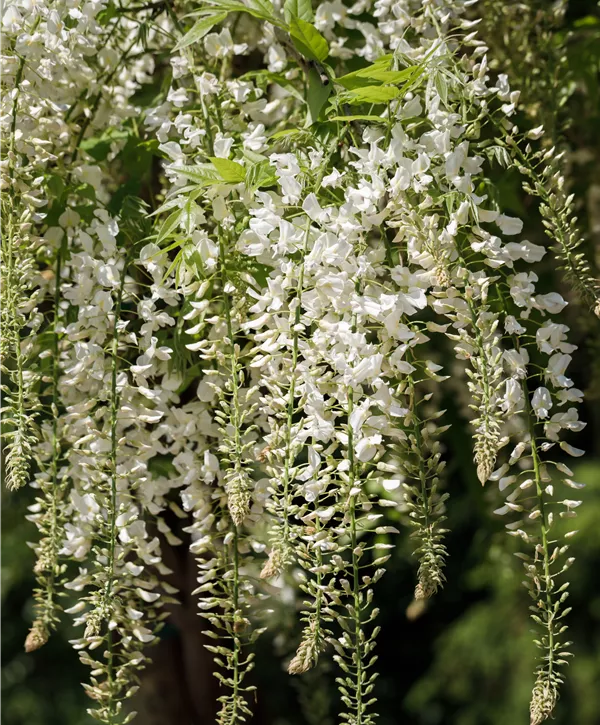 Der Weiße Blauregen 'Alba' (Wisteria sinensis) ist eine rankende Gartenpflanze, die weiße, in Trauben angeordnete Blüten mit einem angenehmen Duft hervorbringt. Sie erscheinen von Mai bis Juni. An einem sonnigen bis halbschattigen, windgeschützten Standort mit durchlässigem, lockerem, nährstoffreichem Boden erreicht er gewöhnlich eine Höhe von ca. 15 m und wird ca. 10 m breit.