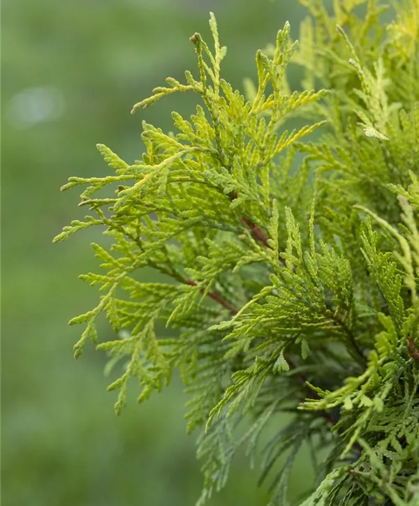 Sehr dekorativ. Der Lebensbaum 'Golden Globe' ist immergrün. Seine Nadeln sind grüngelb, glänzend, schuppenförmig. Orangegelber Austrieb.
