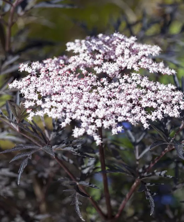 Die rosafarbenen Blüten des Schwarzen Holunder 'Black Lace'(s) erscheinen in Schirmtrauben von Juni bis Juli. Diese sind leicht duftend.