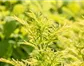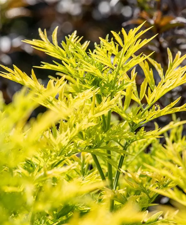 Die sommergrünen Blätter des Schwarzen Holunders 'Golden Tower' sind grüngelb, gefiedert, gegenständig.