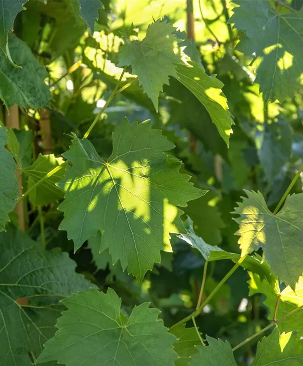 Die sommergrünen Blätter der Tafeltraube 'Muscat Bleu' sind dunkelgrün, herzförmig, gezähnt. Tafeltraube 'Muscat Bleu' zeigt sich leuchtend kupfergelb bis rot im Herbst.