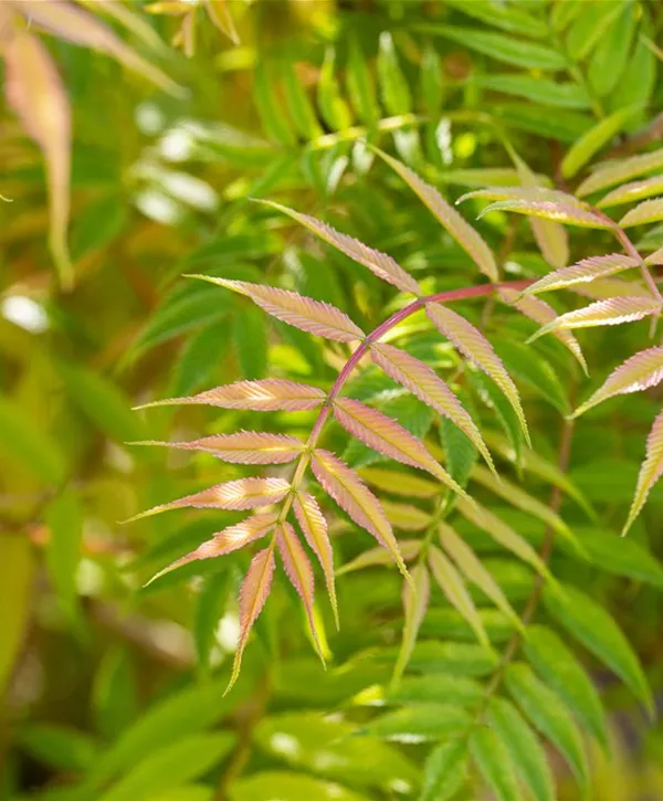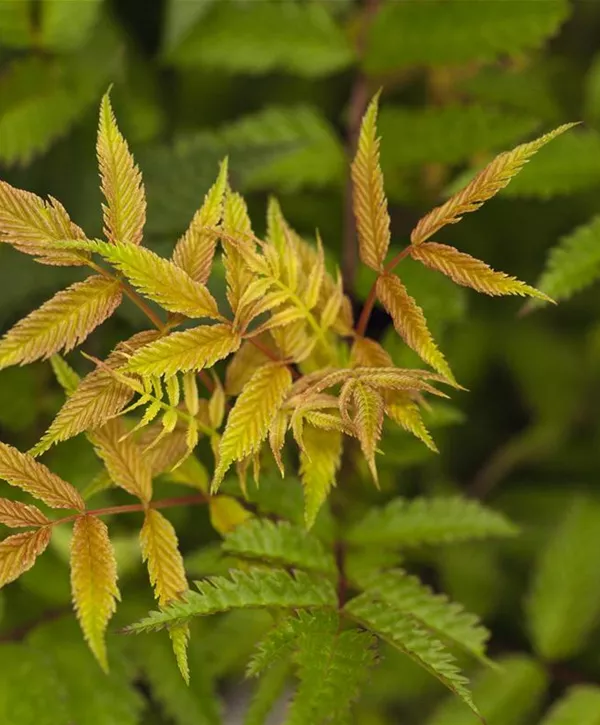Die sommergrünen Blätter der Niedrige Fiederspiere 'Sem'(s) sind grün, gefiedert. Diese sind etwa 20 - 25 cm groß. Roter, früher Austrieb. Niedrige Fiederspiere 'Sem'(s) zeigt sich leuchtend grün-rot im Herbst.