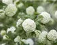 Die weißen, später rosafarbenen, gefüllten Blüten des Gewöhnlichen Schneeball 'Roseum' erscheinen in Schirmtrauben von Mai bis Juni.