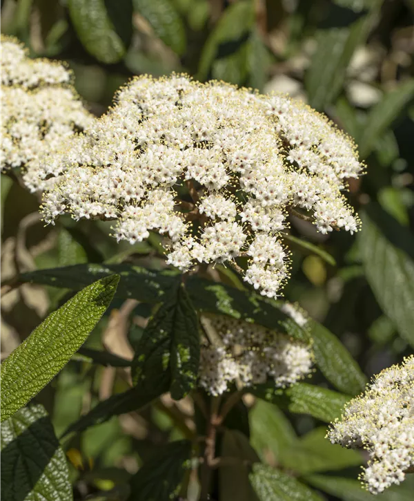 Die cremeweißen Blüten des Zungen-Schneeball erscheinen in Schirmtrauben von Mai bis Juni. Diese sind angenehm duftend.