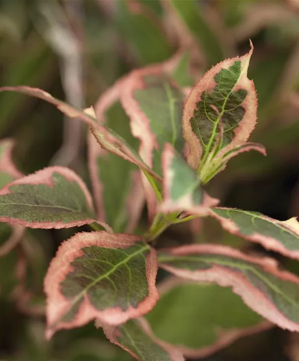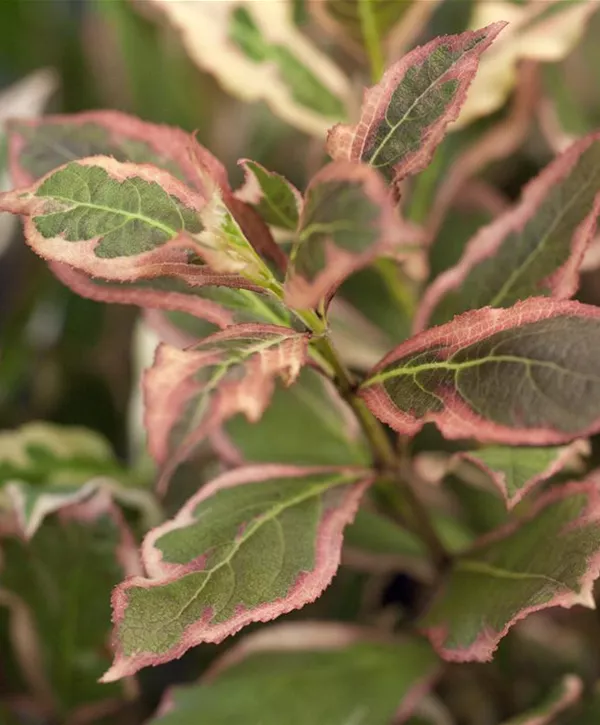 Hoher Blattschmuckwert. Die sommergrünen Blätter der Weigelie 'Monet'® sind grün, eiförmig, gegenständig, gesägt und weisen einen cremeweißen Rand auf. Diese sind etwa 6 - 10 cm groß. Rosafarbener Austrieb. Lange haftend.