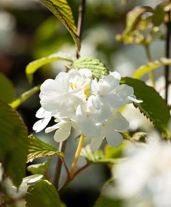 Die weißen, später rosafarbenen, gefüllten Blüten des Schneeball 'Newport' erscheinen in Trugdolden von Mai bis Juni. Diese sind stark duftend.