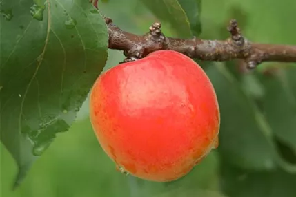 Prunus armeniaca 'Elsa'(s) bildet orange-rote, runde Früchte.