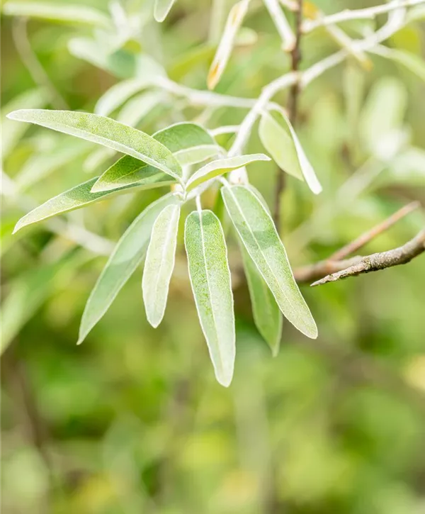 Hoher Blattschmuckwert. Die sommergrünen Blätter der Schmalblättrige Ölweide sind silbrig, lanzettlich, wechselständig. Diese sind etwa 4 - 8 cm groß. Weißer Austrieb.