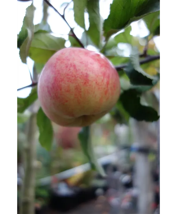 Neue, aromatisch-frische schwedische Sorte, reiche Ernte, knackige, mittelgroße gelblich-grüne Äpfel mit roten Streifen, Reife: 10; haltbar bis März, schorfresistent