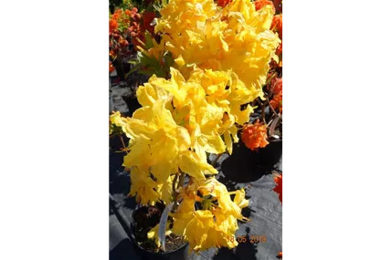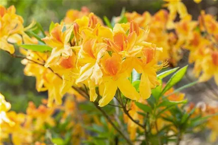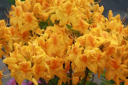 Die Sommergrüne Azalee 'Gibraltar' (Rhododendron luteum) bringt von Ende Mai bis Mitte Juni ein wahres Meer aus kupferorangen Blüten hervor. Dieses kompakt wachsende Gehölz erreicht gewöhnlich eine Höhe von 1 - 1,5 m und eine Breite von 1,5 bis 2 m. Ein halbschattiger (bis schattiger) Standort und ein humoser, kalkfreier Boden schaffen optimale Bedingungen für ein gesundes Wachstum. Die Sommergrüne Azalee 'Gibraltar' ist gut frostverträglich.