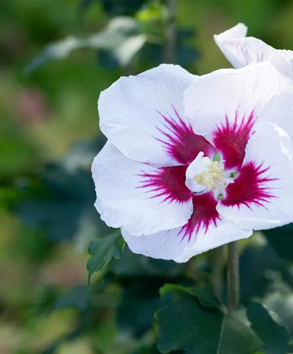 Der Garteneibisch 'Helene' (Hibiscus syriacus) ist ein aufrechter, strauchartiger Strauch, der zweifarbige, schalenförmige Blüten hervorbringt. Sie erscheinen von Juli bis September. Zudem trägt der Garteneibisch 'Helene', eiförmige, mittelgrüne Blätter. An einem sonnigen bis halbschattigen, windgeschützten Standort mit durchlässigem, nährstoffreichem Boden erreicht er gewöhnlich eine Höhe von ca. 3 m und wird ca. 1,5 m breit.