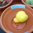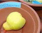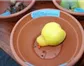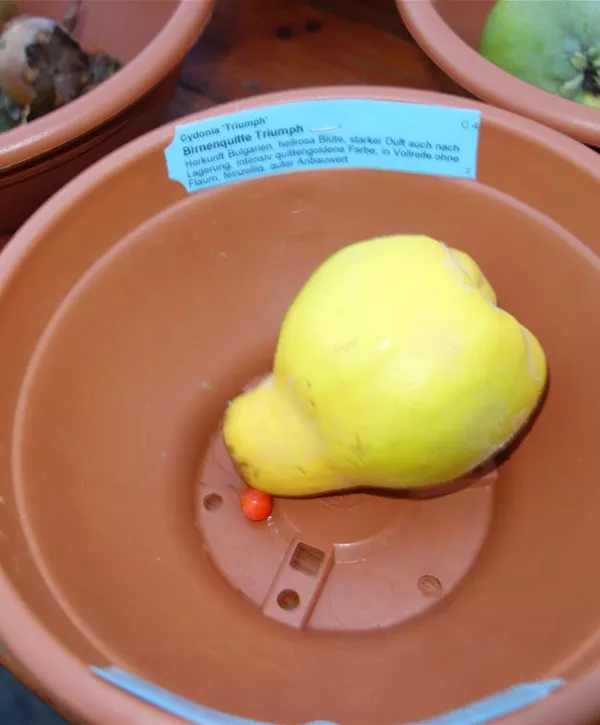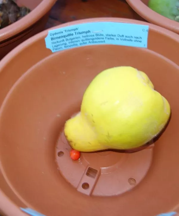 Cydonia oblonga 'Triumph' bildet goldgelbe, birnenförmige Früchte.