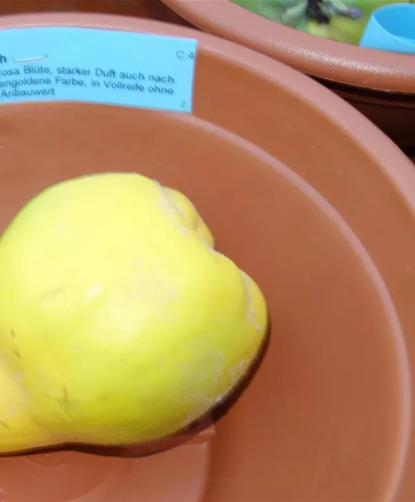Die Quitte 'Triumph' (Cydonia oblonga) bildet goldgelbe Früchte. Sie sind birnenförmig und haben einen süß-säuerlichen, aromatischen Geschmack. Für eine ertragreiche Ernte ab Oktober schaffen durchlässiger, nährstoffreicher Boden und ein sonniger bis halbschattiger Standort optimale Bedingungen. Ihre hellrosafarbenen Blüten sind eine schöne Erscheinung. Die Quitte 'Triumph' wird mit ihrem aufrechten, breiten und lockeren Wuchs etwa 5 m hoch und 6 m breit.