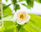 Die cremeweißen, schalenförmigen Blüten erscheinen im Juni.