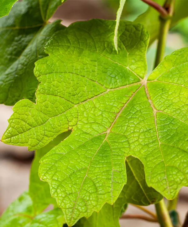 Die sommergrünen Blätter der Tafeltraube 'Vanessa'® sind dunkelgrün, herzförmig, gezähnt. Tafeltraube 'Vanessa'® zeigt sich leuchtend kupfergelb bis rot im Herbst.
